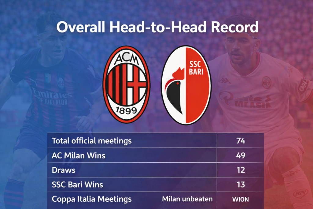 According to the Transfermarkt AC Milan vs SSC Bari head-to-head record, Milan hold a clear historical advantage across all official competitions.