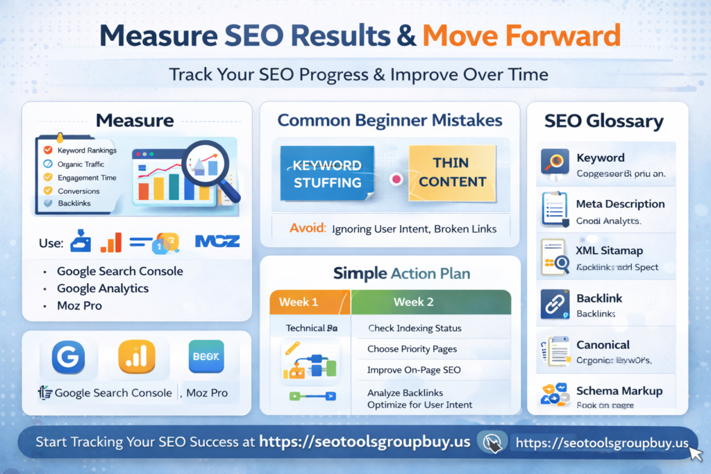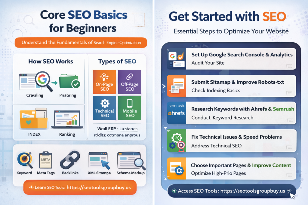 Google Search Console and Google Analytics are the first tools most beginners need. Keyword research tools help find search terms and content opportunities. Page speed tools help evaluate performance. Crawl audit tools help find broken links, blocked pages, redirect chains, and duplicate content. For backlink analysis, keyword research, and competitor tracking, tools like Ahrefs group buy service online can be useful.